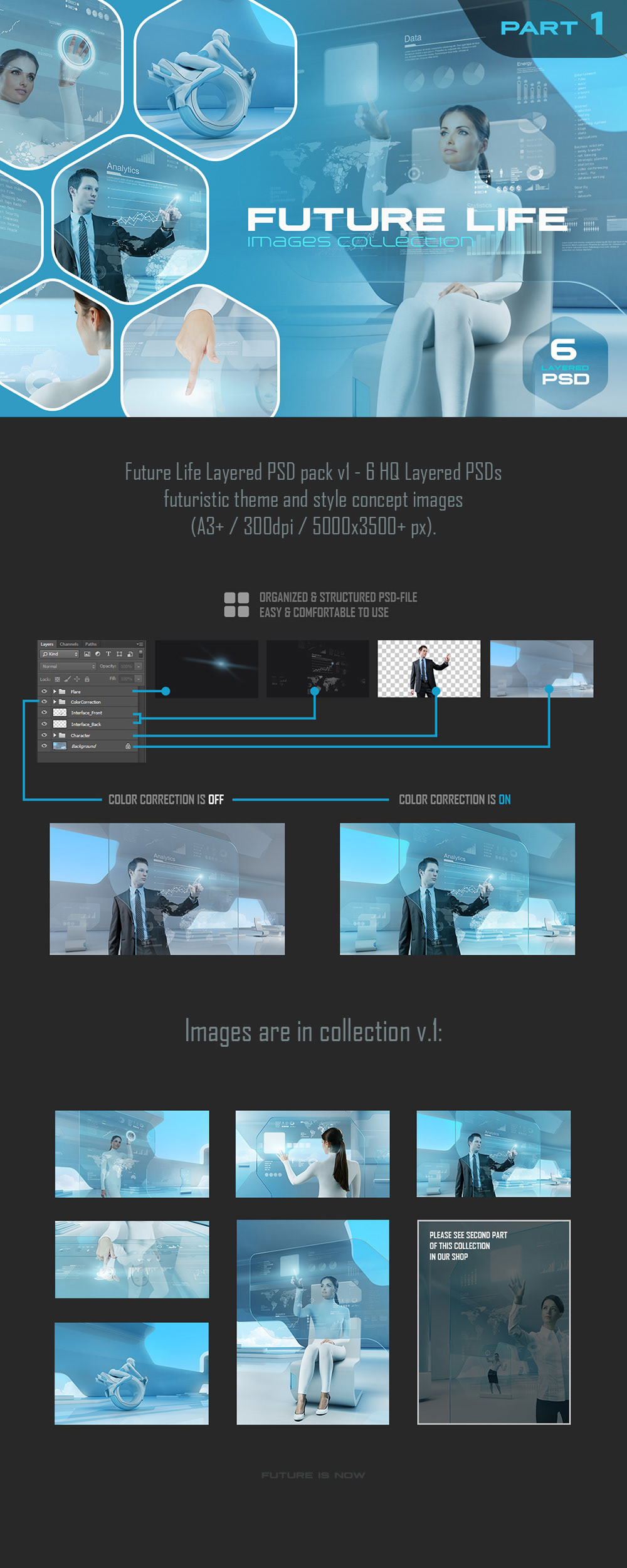 Future Life Layered PSD pack v1 - 6 HQ Layered PSDs futuristic theme and style concept images (A3+ / 300dpi / 5000x3500+ px). Create your own digital future world:) --- **What you can do:** - place your own persons instead existing people (or fully remove them) - change interface operating these people by How The Files are organized: - Background - Person - Interface - Possible additional graphic elements - Color Correction Layers Note: Bike is merged to background ------------------------------------------------------ Ideal for illustration, web, banners, promo, print, package etc. Future is now:)