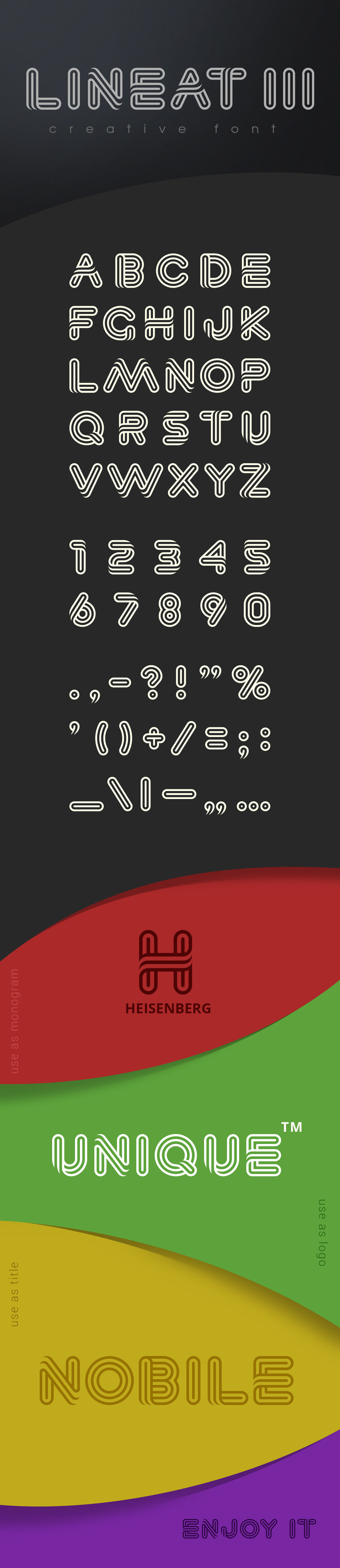 Lineat III is alternative version of LINEAT font. It is stylish innovative creative font can be used as logo design and branding, titles & headers, posters & banners in such areas as fashion, high-tech, internet & computers, business innovations, sport & entertainment etc